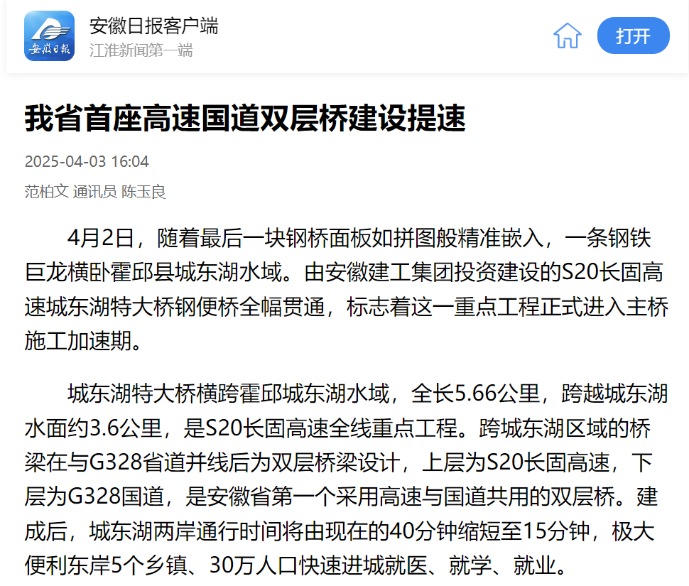 安徽建工S20长固高速路基01标工区负责人经云介绍,城东湖特大桥横跨城东湖水域,全程5.66km,是安徽省首个采用高速与国道共用双层桥跨越湖泊项目,其中上层为S20长固高速,下层为G328国道。