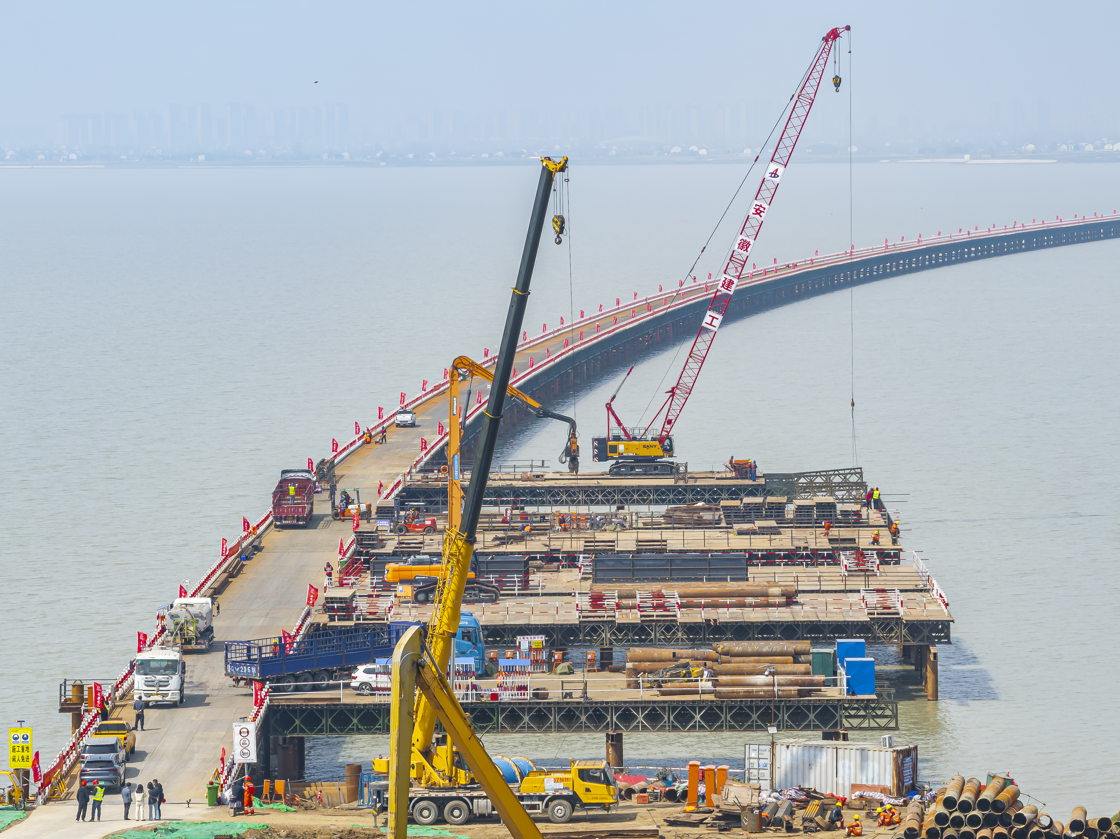 此次贯通的钢便桥全长3.5公里,作为主桥施工的“生命线”,承担着机械通行、材料运输等关键任务。为确保钢便桥顺利贯通,项目团队东西两岸双向推进、同步攻坚,科学调配人员、物资等要素,历时83天顺利实现全幅贯通,较原计划提前20天完成任务。