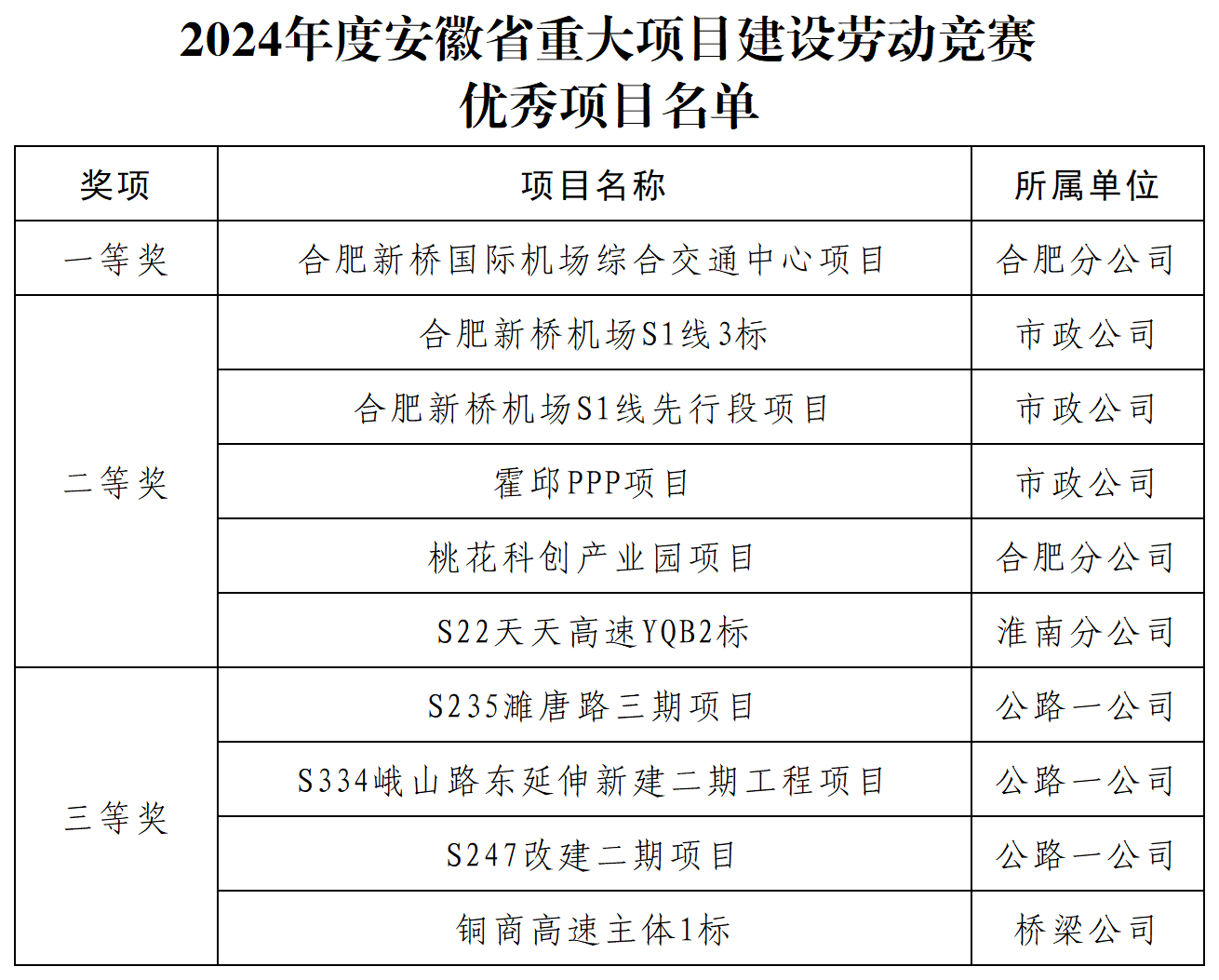 近日,安徽省住建厅与省总工会对2024年度重大项目建设劳动竞赛参赛项目进行了通报表扬,公司承建的合肥新桥国际机场综合交通中心项目、S1线3标等10个项目荣获优秀项目称号。