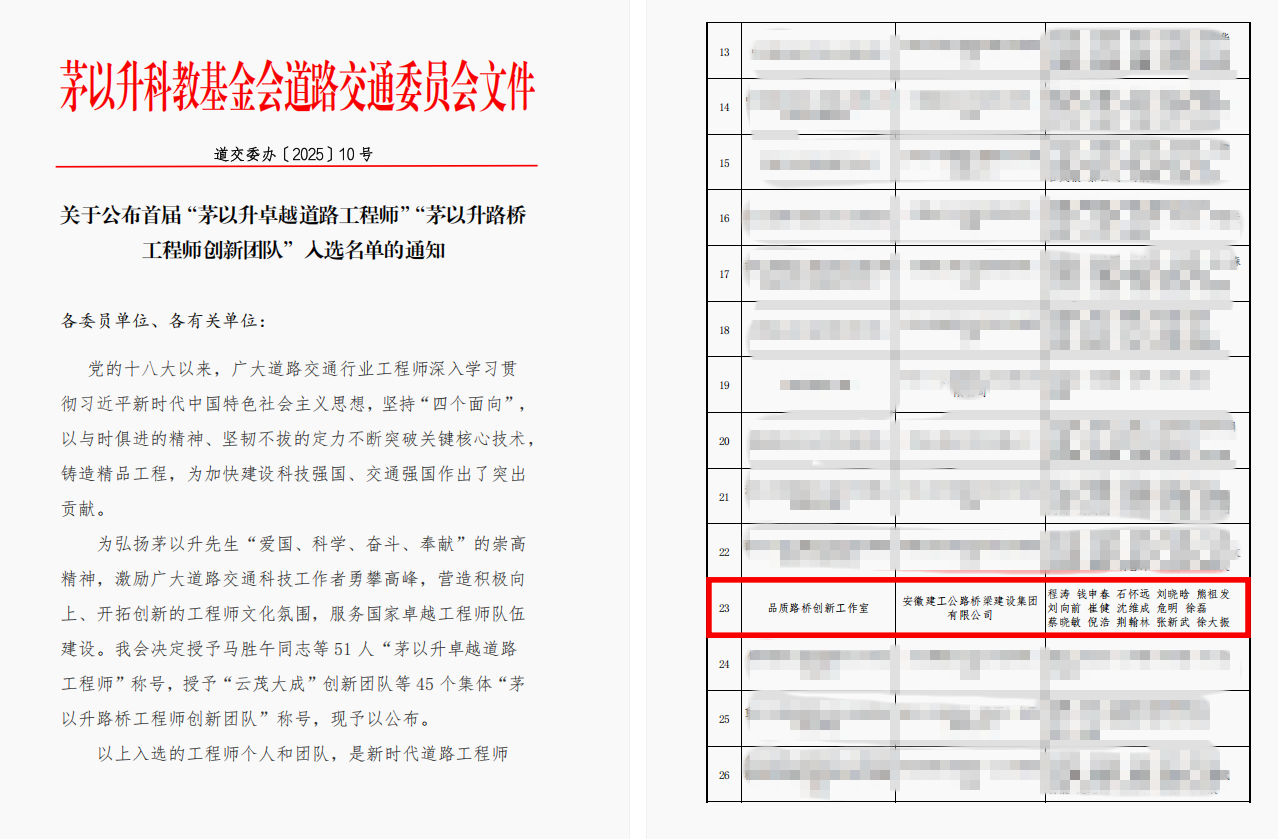 近日,茅以升科技教育基金会道路交通委员会公布首届“茅以升路桥工程师创新团队”评选结果,公司“品质路桥创新工作室”凭借扎实的技术攻关能力与突出的工程实践成果成功入选。