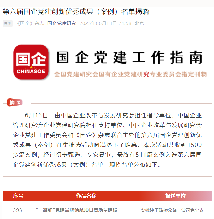 近日,中国企业改革与发展研究会企业党建工作委员会和《国企》杂志联合主办的第六届国企党建创新优秀成果(案例)征集推选活动圆满落下帷幕,公司《“一路红”党建品牌领航项目高质量建设》党建案例从1500多篇案例中脱颖而出,获评第六届国企党建创新优秀成果(案例)。