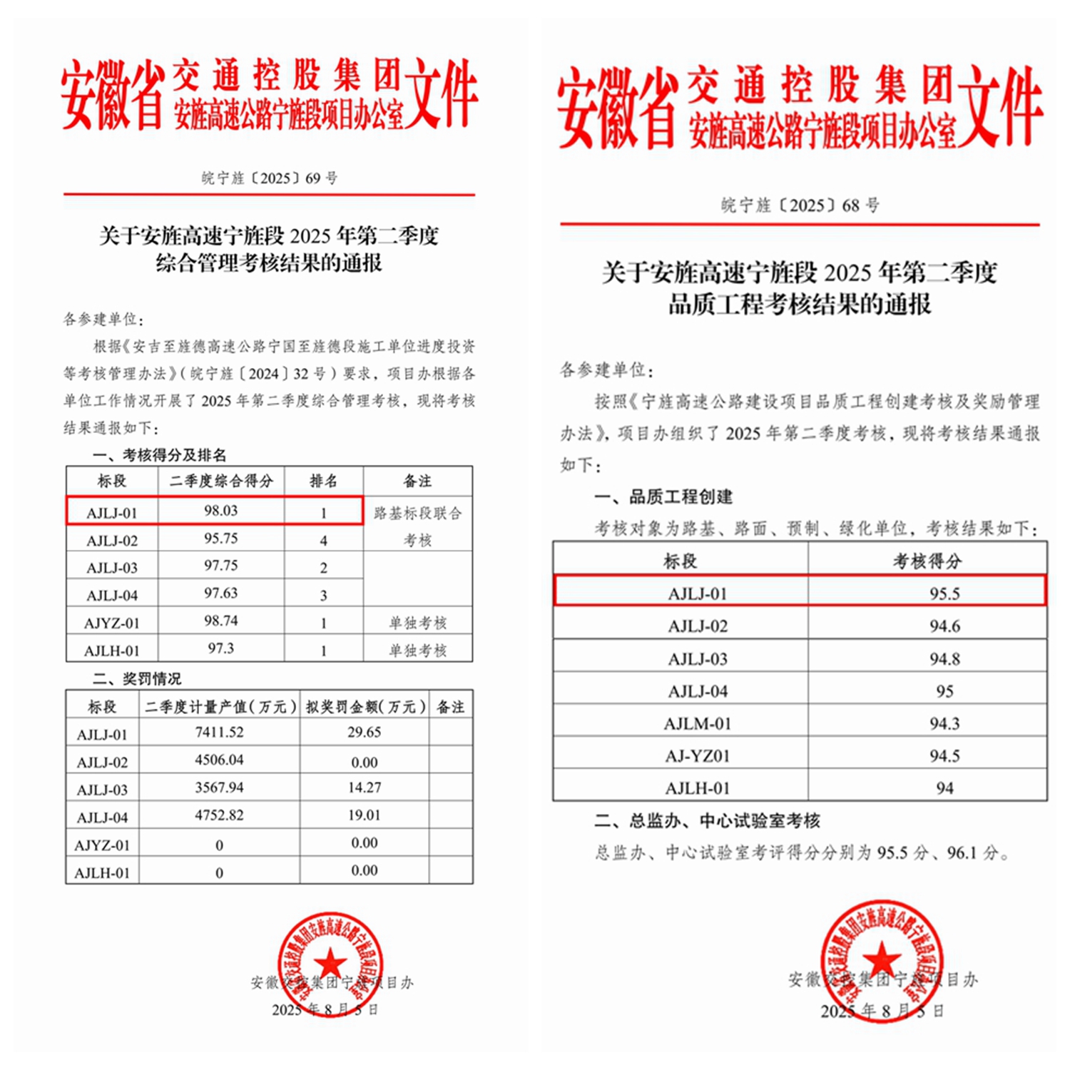 近日,安旌高速宁旌段办公室公布了2025年第二季度综合管理考核及品质工程创建考核结果,公司承建的宁旌高速路基1标在两项考核中均获得施工单位“第一名”。
