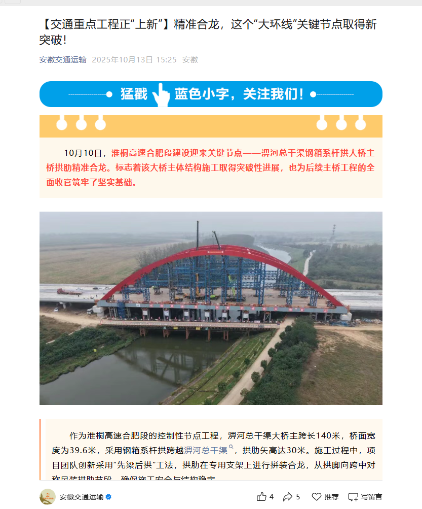 近日,央广网、安徽日报、安徽交通运输、大皖新闻等主流媒体聚焦报道淮桐高速合肥段路基2标淠河总干渠大桥拱肋合龙。