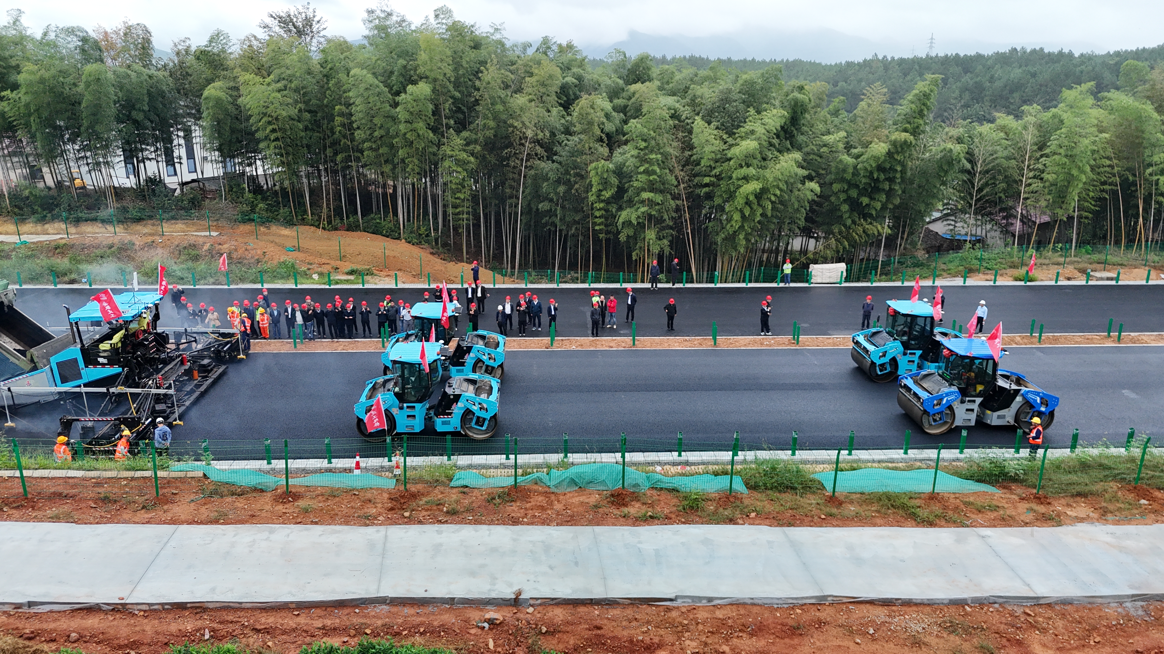 在泾青高速项目观摩现场,无人驾驶智能施工集群精准高效开展沥青上面层作业,成全场焦点。该智能施工系统针对高速公路长距离、高标准的建设需求,通过北斗高精度定位技术绘制三维“数字蓝图”,将道路平竖曲线、超高渐变段等关键参数精准导入控制系统,定位精度稳定保持在3毫米级,完美适配高速公路对路面平整度的严苛要求。观摩团随后前往泾青高速项目,考察沥青拌和站低碳节能生产实践。