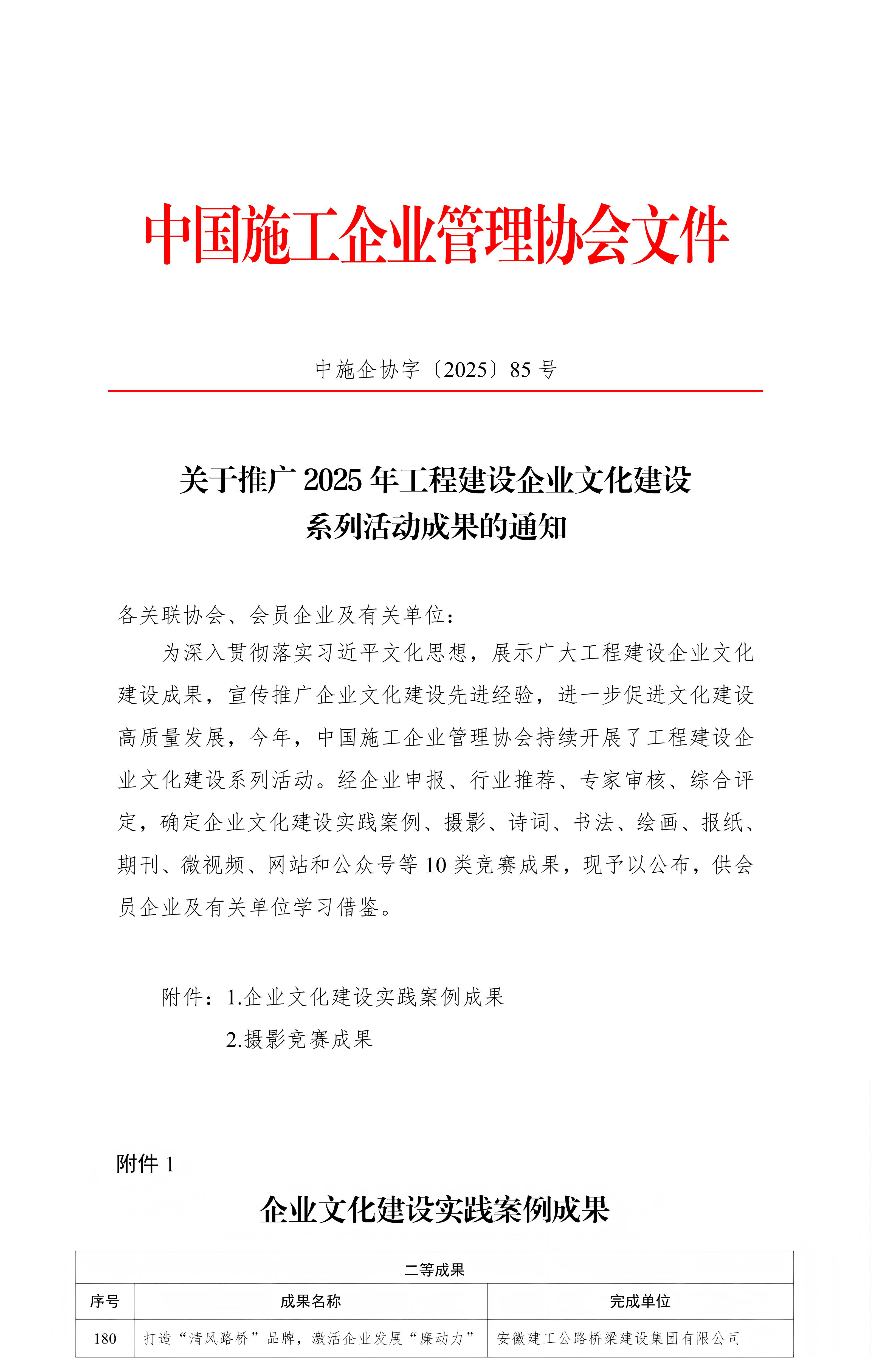近日,中国施工企业管理协会公布了2025年工程建设企业文化建设实践案例成果评选结果,公司《打造“清风路桥”品牌,激活企业发展“廉动力”》从全国众多申报案例中脱颖而出,荣获企业文化建设实践案例二等成果。这是继上半年公司“清风路桥”廉洁文化品牌获评2025年工程建设企业党建工作典型案例后,再次获得中国施工企业管理协会表彰,充分展现了公司在廉洁文化建设领域的持续深化与品牌影响力。