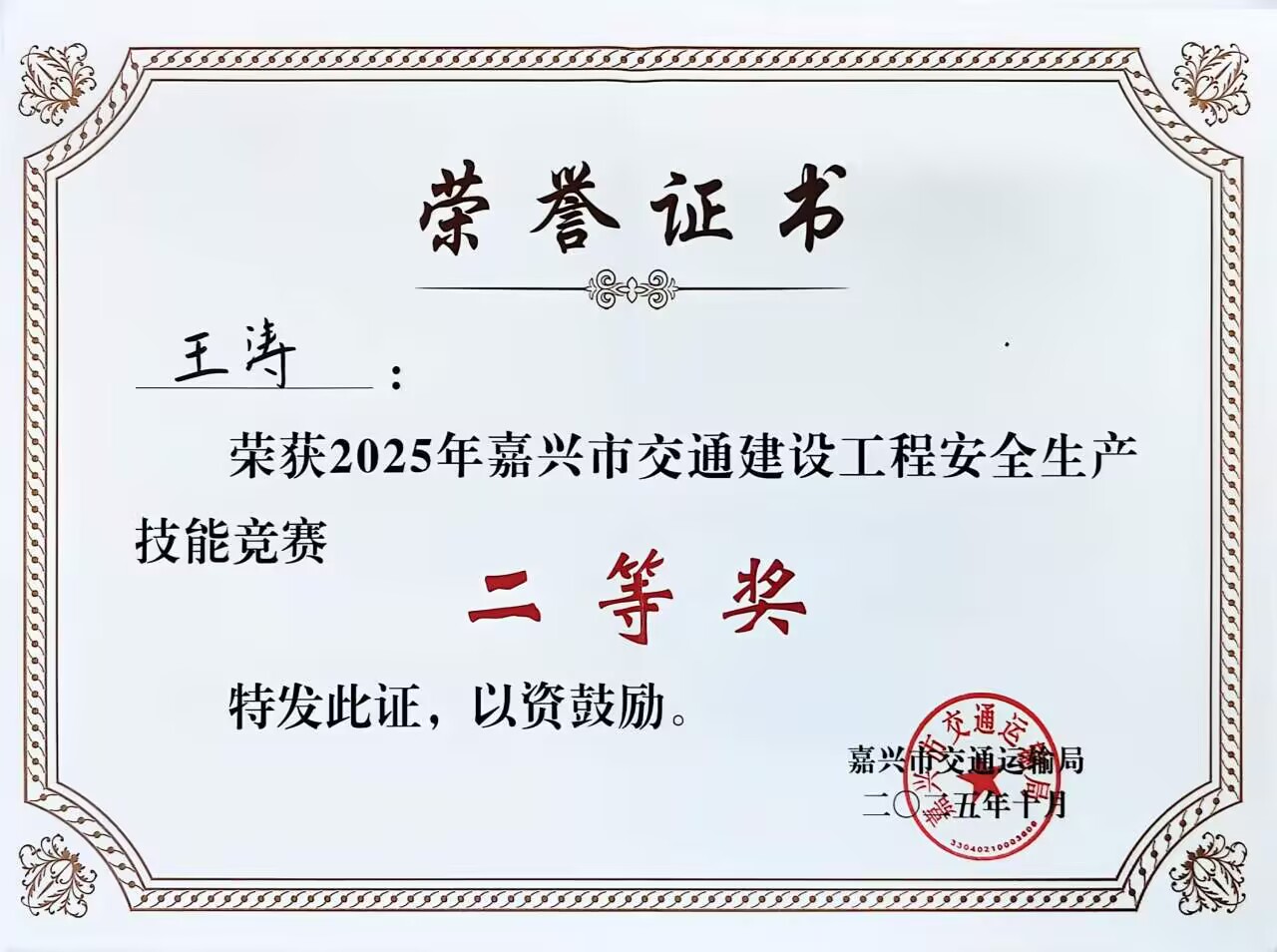 10月30日,由嘉兴市总工会、嘉兴市交通运输局联合举办的2025年嘉兴市交通建设工程安全生产技能竞赛,在浙江分公司524国道TJ01标项目圆满举行。项目精心选派的参赛选手王涛凭借出色发挥,荣获二等奖。