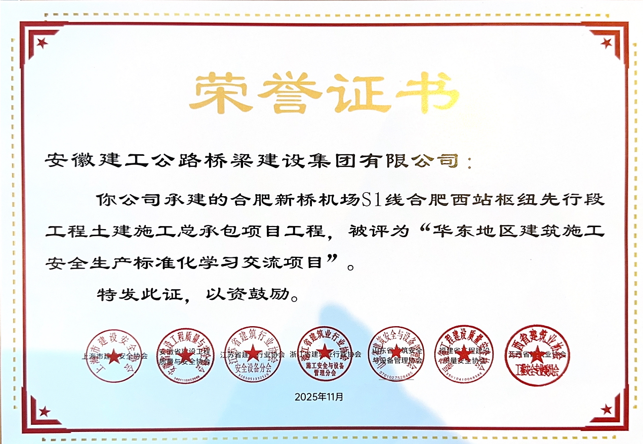 近日,华东地区建筑安全联席会公布了“2025年度华东六省一市建筑施工安全生产标准化工地学习交流项目名单”,公司承建的合肥新桥机场S1线土建施工总承包3标、合肥新桥机场S1线合肥西站枢纽先行段工程土建施工总承包项目光荣上榜。邵嘉兵、宋广辉获评优秀项目经理称号,李苏苏、段兴一获评优秀项目安全总监称号。