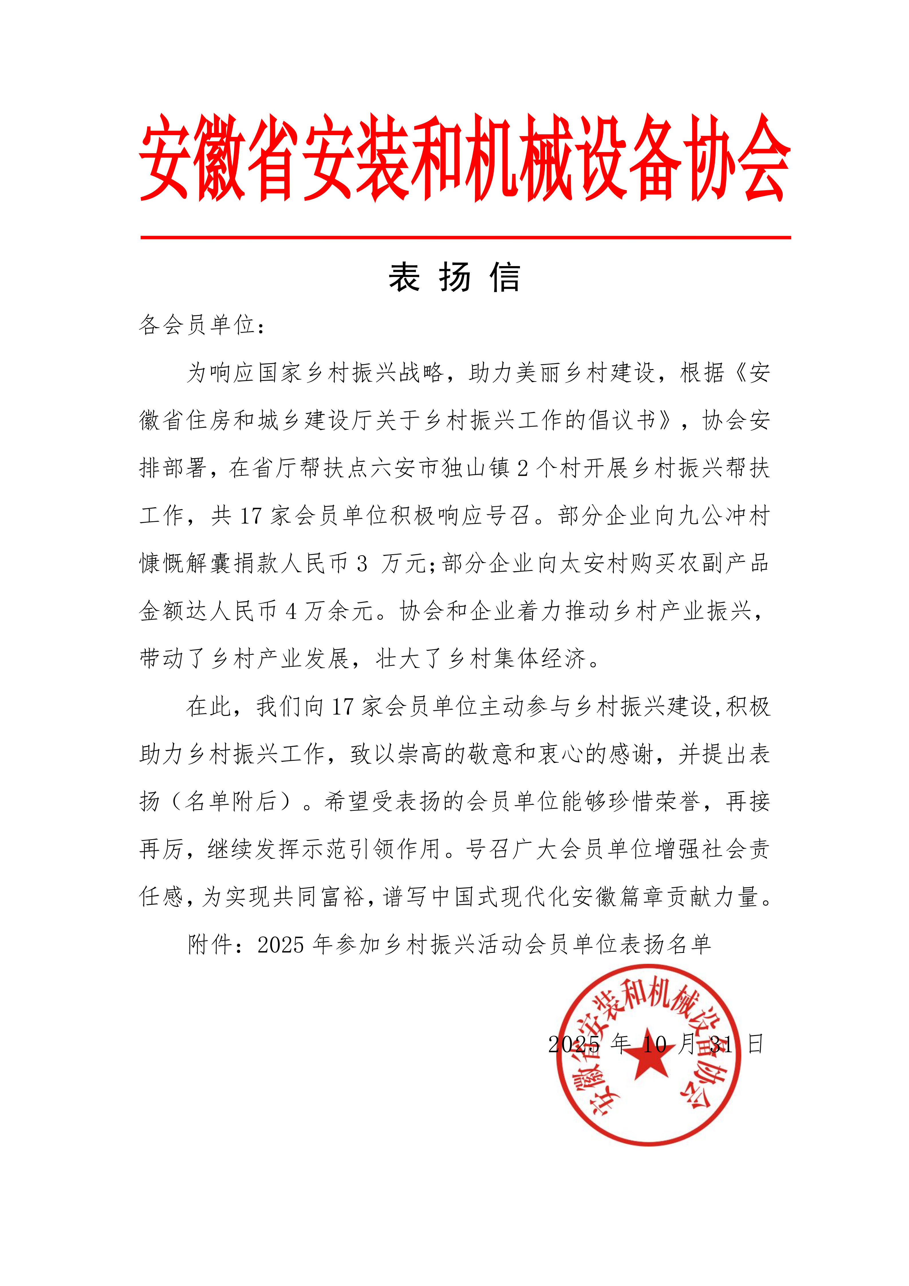 公司积极响应国家乡村振兴战略,助力美丽乡村建设,根据《安徽省住房和城乡建设厅关于乡村振兴工作的倡议书》,协会安排部署,着力推动乡村产业振兴,带动了乡村产业发展,壮大了乡村集体经济。——安徽省安装和机械设备协会