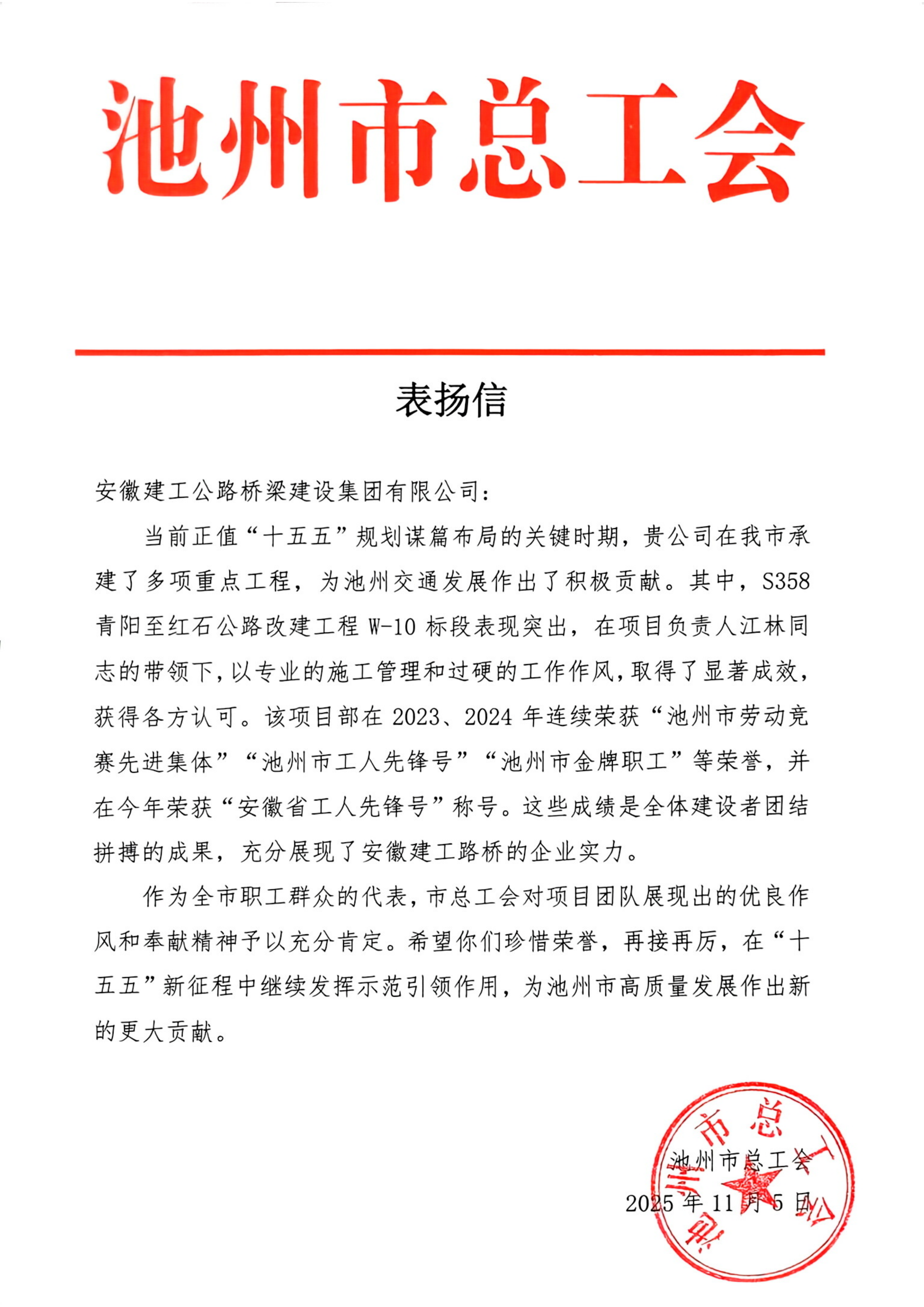 公司承建S358青阳至红石公路改建工程W-10标段表现突出,以专业的施工管理和过硬的工作作风,取得了显著成效,获得各方认可。——池州市总工会