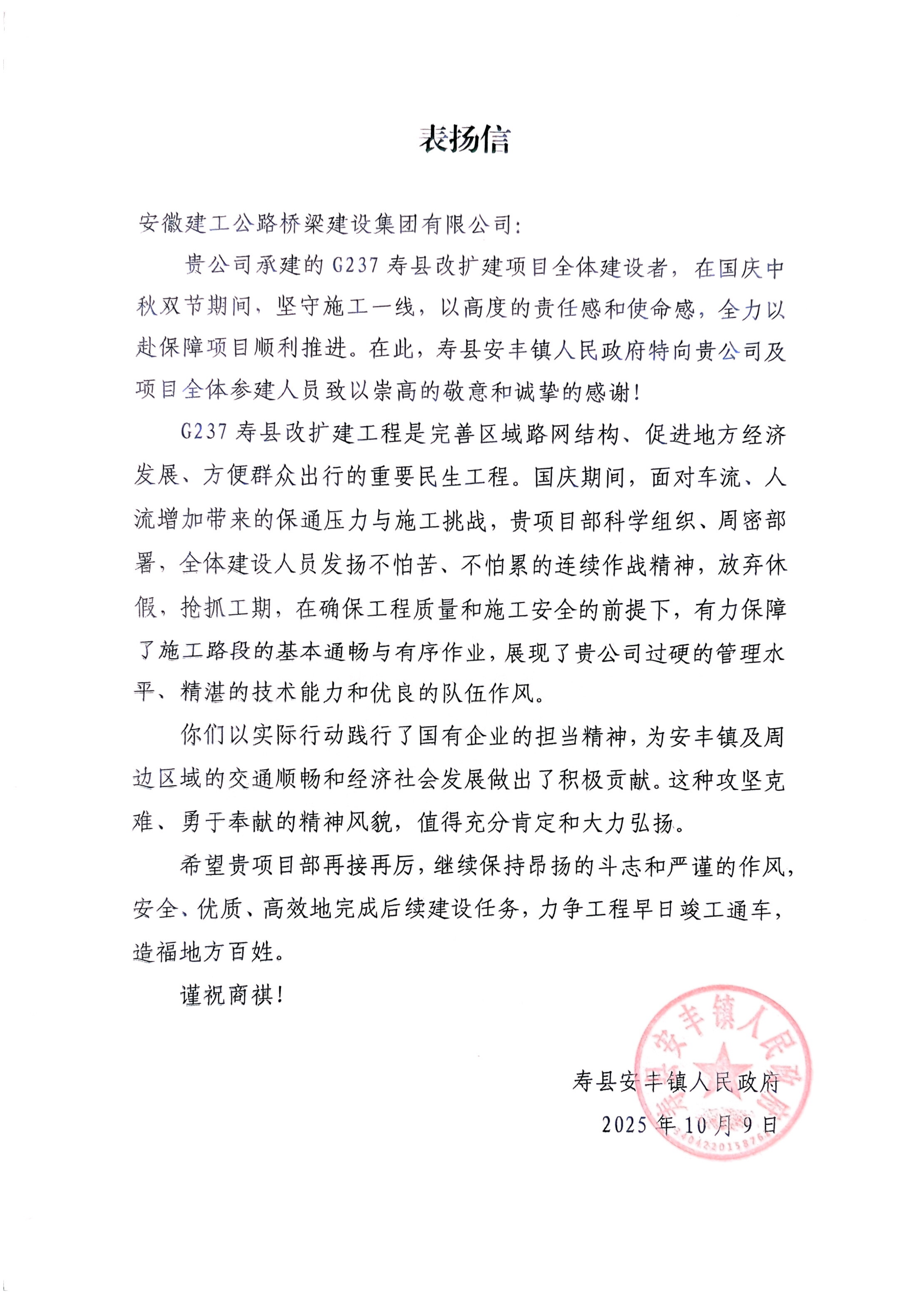 公司承建的G237寿县改扩建项目全体建设者,在国庆中秋双节期间,坚守施工一线,以高度的责任感和使命感,全力以赴保障项目顺利推进。为安丰镇及周边区域的交通顺畅和经济社会发展做出了积极贡献。——寿县安丰镇人民政府