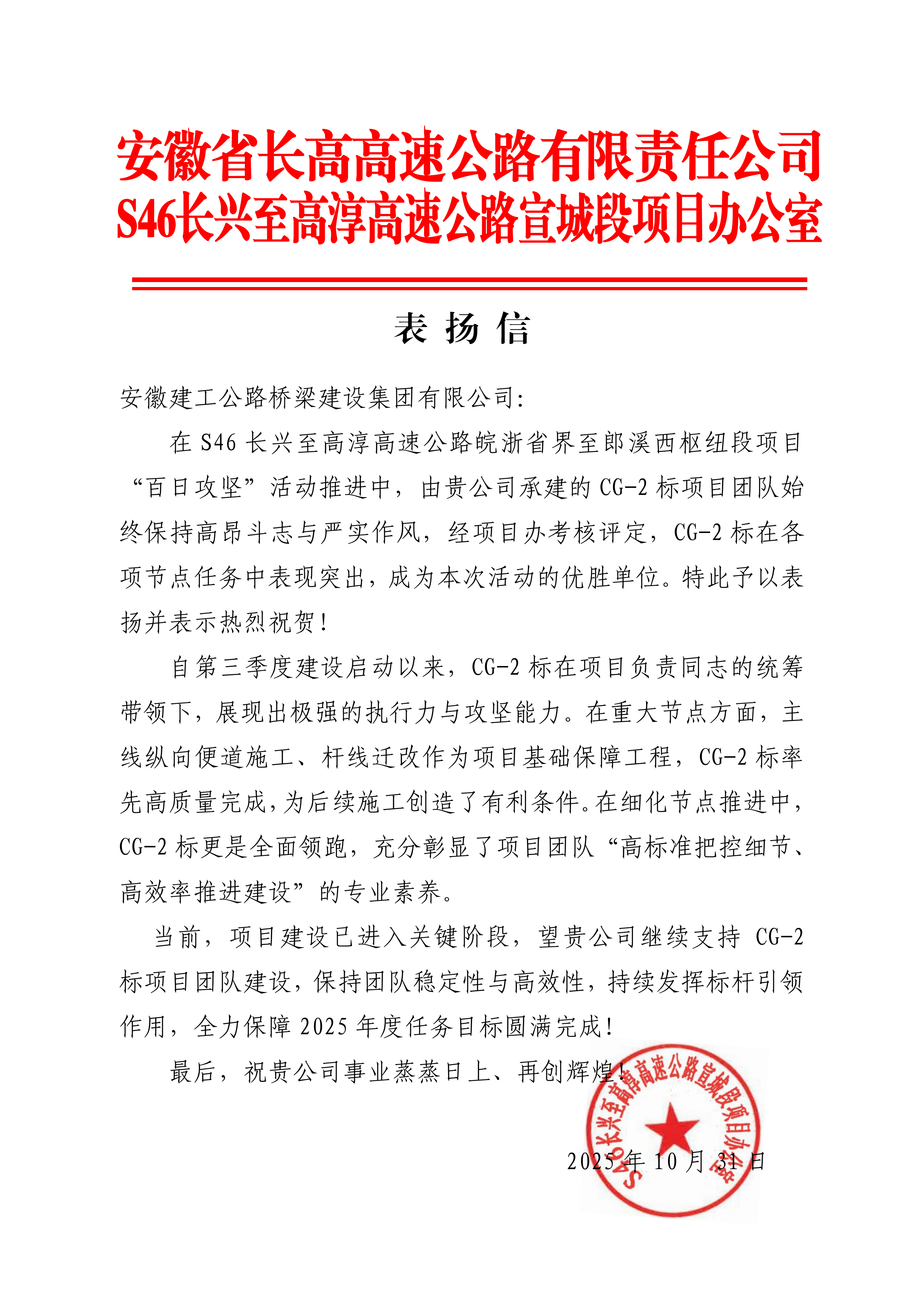 公司承建的CG-2标项目团队始终保持高昂斗志与严实作风,经项目办考核评定,CG-2标在各项节点任务中表现突出,成为本次活动的优胜单位。——安徽省长高高速公路有限责任公司