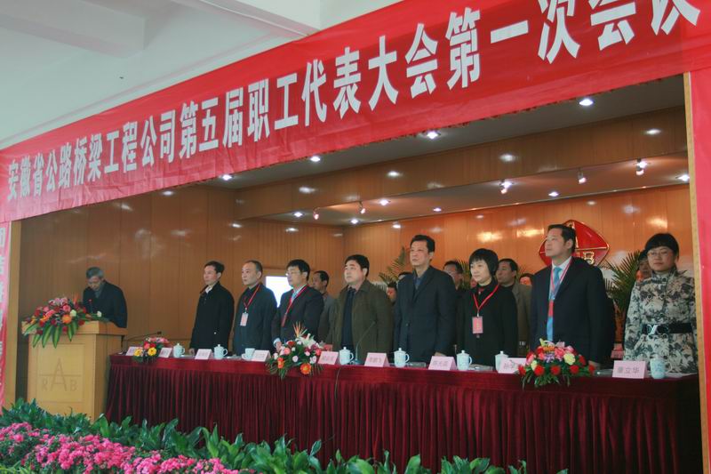 8:45,在庄严的国歌声中,第五届职工代表大会第一次会议正式开幕。公司总经理汪卫东向大会作了题为《统一思想 坚定信心 为实现安徽路桥的新崛起而奋斗》的工作报告。汪总在报告中指出,这次会议,是在当前国家扩大内需、加大基础设施建设的特殊环境下,是在集团公司对当前经济形势科学研判和正确部署下,是在路桥公司谋求新崛起的关键时刻召开的一次十分重要的会议。