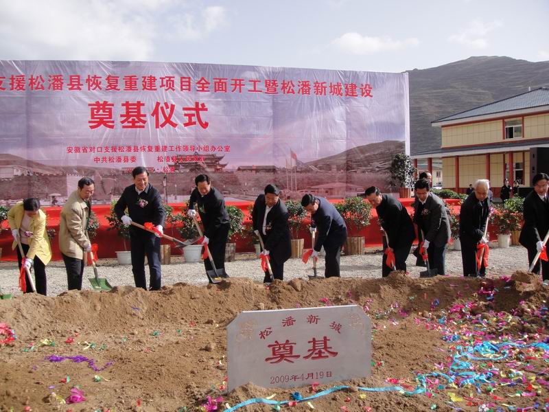 安徽省驻松援建办主任孔晓宏首先介绍了开工项目情况,松潘县委书记、县人大常委会主任黄芝林致辞发言,施工单位、监理单位代表分别作了发言。阿坝州州长吴泽刚、安徽省省长助理、省对口援建办主任梁卫国也先后作了重要讲话。最后,安徽省人大副主任朱先发宣布安徽省对口援建松潘县恢复重建项目全面开工,安徽省、四川省、阿坝州、松潘县领导在隆隆的礼炮声中为松潘新城建设开挖了第一锹土。