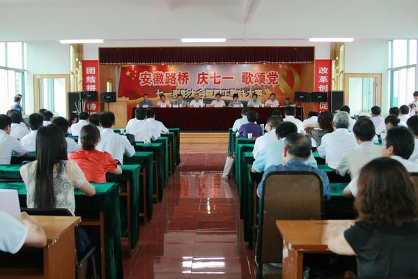会议在雄壮的《国际歌》声中开始。党委书记陈光磊作了《牢记宗旨、珍惜荣誉、勇往直前》激情洋溢的讲话。她说:今天我们大家在此欢聚一堂,纪念我们伟大的中国共产党成立88周年,并对公司2008年度的先进基层党组织和优秀党员、党务工作者进行集中表彰。这是一个喜庆的日子,也是一个值得纪念的日子。在此,我谨代表公司党委对所受表彰的先进单位和个人表示热烈的祝贺,向公司所有的党员表示崇高的敬意。接着她深情回顾了党的光辉历程,同时要求我们也应该更加自觉地牢记党的宗旨,在自己的工作岗位上勤奋、踏实、敬业的工作,为党徽增光,为党旗添彩。随后,陈书记对2008年的党委工作进行了回顾总结,并对2009年下半年就如何进一步加强党的建设,深入学习实践落实科学发展观,更好地发挥党组织的政治核心作用、战斗堡垒作用和党员的先锋模范作用,提了几点要求:一、继续认真开展学习实践科学发展观活动,充分认清制约公司科学发展的问题,并有效整改,使公司走上科学发展的轨道;二、转变观念,找准党建工作的“切入点”,积极主动的融入中心工作,充分发挥基层党组织的战斗堡垒作用;三、充分发挥共产党员先锋模范作用,增强号召力、凝聚力、战斗力。最后,陈书记号召全体党员把全部心思和精力集中到加快公司发展上,把各方面的力量凝聚到加快公司发展上,把共产党人的先进性体现到加快公司发展上,以更加饱满的热情、更加务实的精神、更加积极的工作状态投入到各项工作中去,团结带领公司广大员工,努力把握发展的大好机遇,为促进安徽路桥的稳健发展做出新的贡献。
