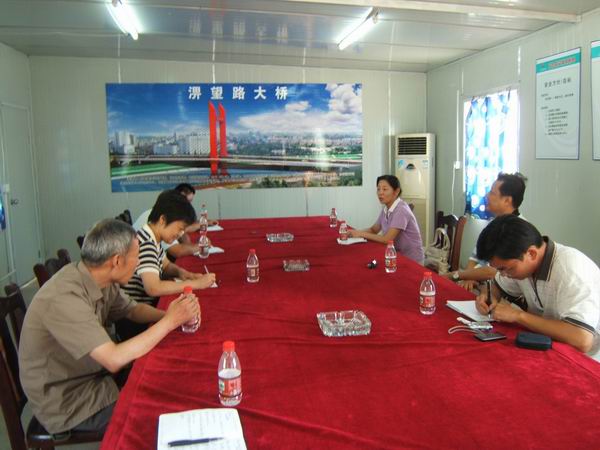 在项目部会议室,李主席等领导仔细听取项目经理江仲明的介绍,不时关切地询问工程相关情况。工会主席赵其荣向集团工会李主席等一行在高温天气下来公司淠望路大桥项目部慰问表示感谢。