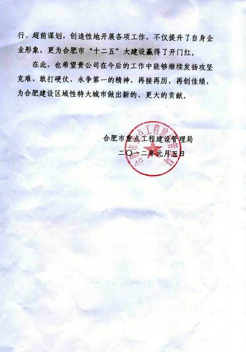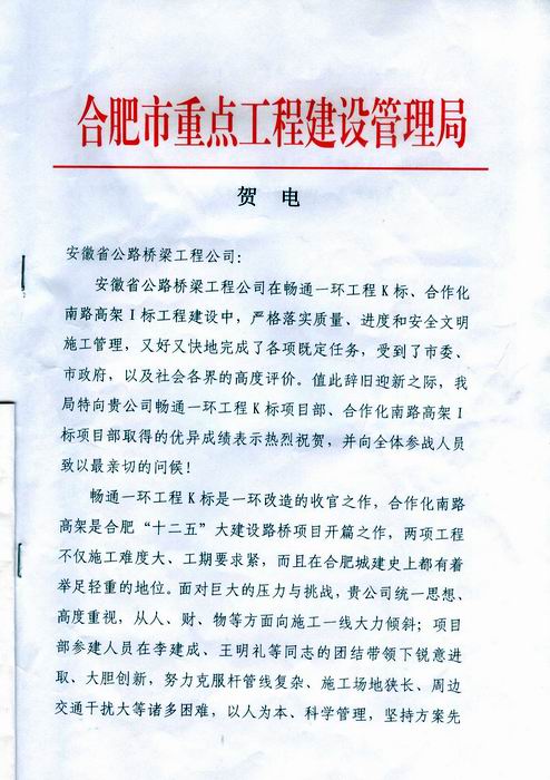 近日,公司收到合肥市重点工程建设管理局发来的贺电,贺电对公司在2011年合肥市政大建设中取得的优异成绩表示热烈祝贺,对公司高度重视合肥市政工程建设,从人财物等方面向施工一线倾斜给予了高度评价,对公司一环K标、合作化南路高架桥1标两个项目全体参建人员克服诸多困难、锐意进取、科学谋划、创造性的开展各项工作,为合肥市“十二五”大建设赢得了开门红给予了充分肯定。