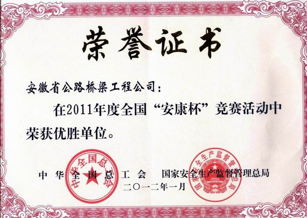 近日,公司喜获全国“安康杯”竞赛优胜单位称号。