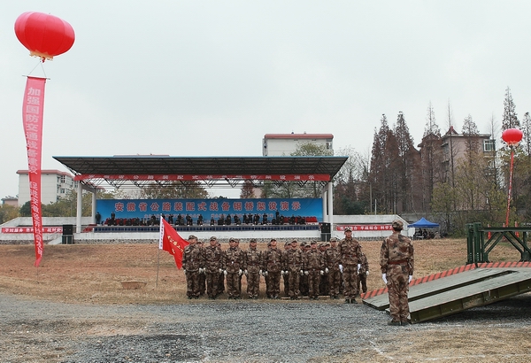 下午,在合肥警备区教导队训练场,红旗招展,彩球飘扬。公司从各单位、各项目抽调的50名队员经过为期一周的军事化训练,精神抖擞、整装待发。15:00时,演示活动正式开始。随着梅厅长一声令下,队员们高举“安徽省公路工程保障大队”旗帜,齐喊口号,跑步进入现场,开始架设。在架设的同时,进行了现场同期声解说。短短30分钟内,队员们分工明确,技术熟练,配合默契。在没有机械设备的情况下,依靠人工肩扛手抬,迅速完成了桁架、桥面板等搭设,将钢桥推过河,随后三辆炮车缓缓通过,进行装备通载检验。至此,战备钢桥架设演示圆满完成。演示活动结束后,领导们上桥检阅,亲切地接见、慰问了参演队员,并合影留恋。