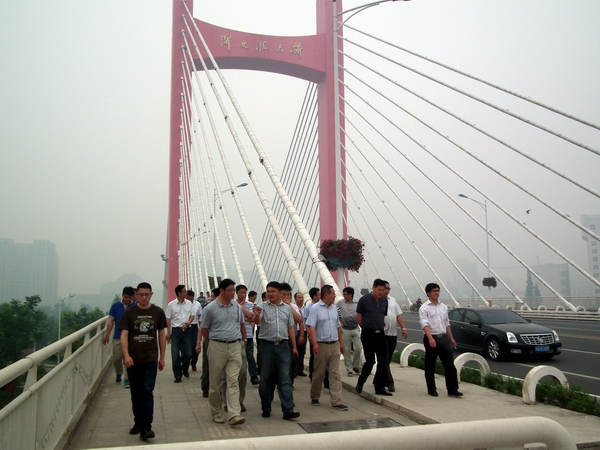 观摩团一行首先来到淠史杭大桥前驻足参观。在随后召开座谈会上,石怀远代表公司就该工程的实施、技术要点、质量安全管理、工程进度等情况向与会人员作了简要汇报。公司副总工程师陈莘对该桥的工艺和施工要点作了讲解。重点局项目管理二处郑浩处长指出,安徽路桥在斜拉桥施工上有着有目共睹的成绩,希望能结合以前的施工案例,总结经验,以争取更大的发展空间。