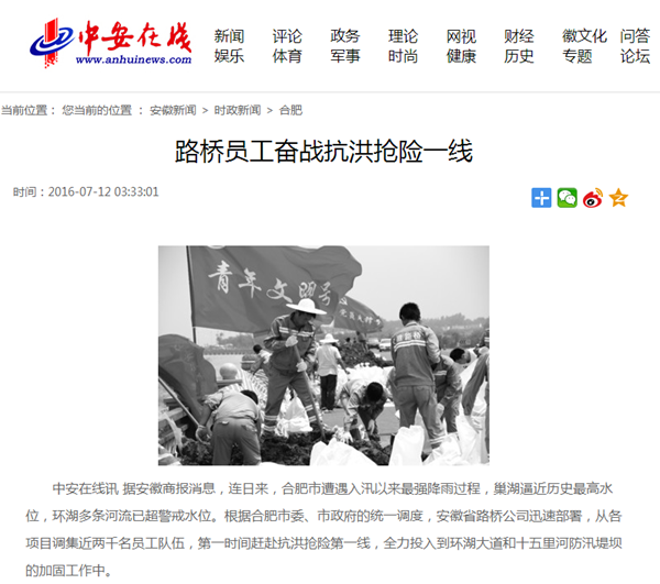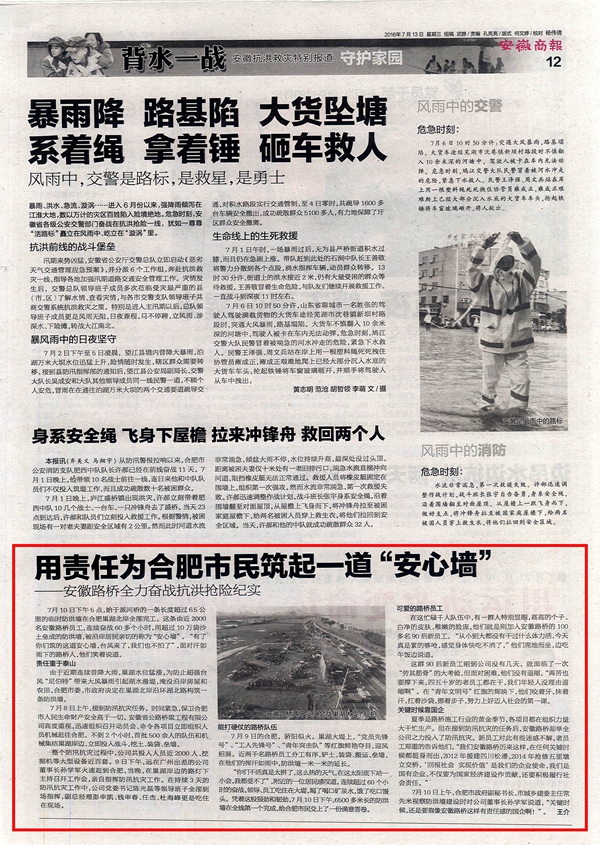 省级媒体聚焦公司抗洪抢险工作 发布时间:2016年07月13日 来源:党委办公室 发布人: 作者:王东 浏览:4498次 近日,公司积极响应合肥市委、市政府号召,全力参与环湖大道和十五里河抗洪抢险的事迹得到社会的高度关注。7月12日、13日,中安在线、《安徽商报》等多家省级媒体对公司抗洪抢险事迹进行了连续报道。