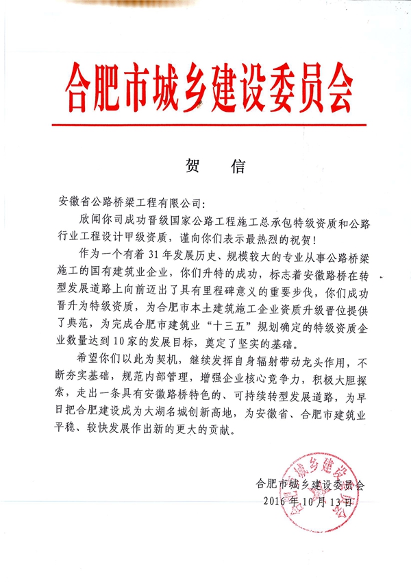 近日,合肥市城乡建设委员会向公司发来贺信,热烈祝贺公司晋升国家公路工程施工总承包特级资质和公路行业工程设计甲级资质。