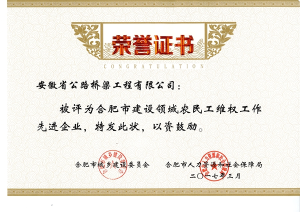 公司荣获“合肥市建设领域农民工维权工作先进企业” 称号 发布时间:2017年04月27日 来源:市政分公司 发布人: 作者:董丁祥 浏览:2881次 近日,合肥市城乡建设委员会、人力资源和社会保障局表彰了在建设领域农民工维权工作中表现突出的单位,公司荣获“合肥市建设领域农民工维权工作先进企业” 称号。