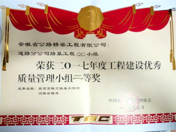 近日,在中国施工企业协会2017年度全国工程建设质量QC小组成果发布暨评审会上,由道路分公司QC小组选送的《提高高填方路基不均匀沉降合格率》成果,从全国千余个QC成果中脱颖而出,以优异的成绩荣获2017年度工程建设优秀质量管理小组成果二等奖,为公司赢得了荣誉。