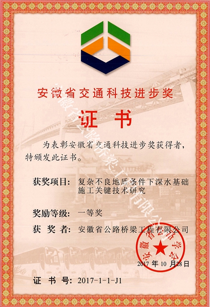 近日,第五届安徽省公路学会交通科技进步奖评审结果正式发布,由公司完成的《复杂不良地质条件下深水基础施工关键技术研究》、《大曲率钢桥面铺装双层高粘SMA沥青玛蹄脂碎石施工技术》等两项研究成果荣获一等奖,《湖沥青改性沥青路用性能研究》研究成果荣获三等奖。在10月29日召开的安徽省公路学会年会上,省交通厅巡视员、省公路学会理事长罗宁等领导为获奖单位颁奖,公司副总经理、总工程师彭申凯代表公司上台领奖。