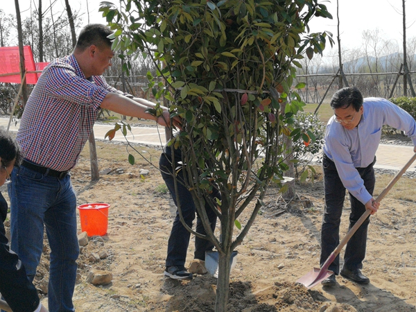 在植树活动现场,信长星与项目负责人共同植下第一棵树,同时给大家讲解了一些植树的技巧和注意事项。