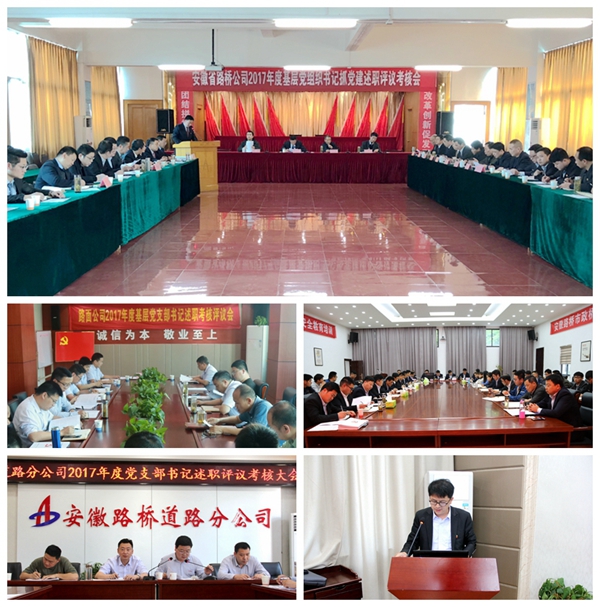 3月份,公司党委组织召开党组织书记抓党建述职评议考核会,所属5个分子公司党组织负责人分别就深入学习贯彻党的十九大精神、履行党建工作责任情况等规定的8个方面进行现场述职,集团党委工作部主任徐文联应邀到会指导并对述职情况进行了点评。4月份至5月份,市政分公司、道路分公司和路面公司按照要求也相继召开党组织书记抓党建述职评议考核会,组织所属党支部负责人围绕规定的方面进行现场述职,公司党委派人参会指导并对述职情况进行点评。两级党组织负责人在述职中讲成绩实事求是,找问题不回避不遮掩、抓整改有思路、有举措,述出了抓党建的责任担当、思路方法和经验成效。