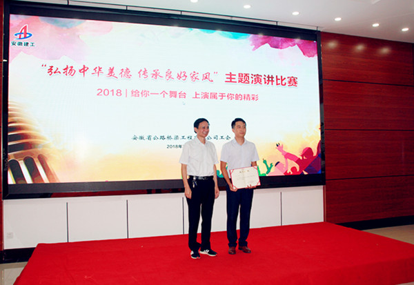 充满激情、精彩不断的演讲博得了现场评委和观众的阵阵掌声。经过紧张激烈地角逐,道路分公司选手沙小佳演讲的《家风》脱颖而出,获得比赛一等奖;路面公司选手李静演讲的《家风的印记》凭借优异表现获得二等奖,市政分公司选手江定真和道路分公司选手郭南兵分获三等奖。