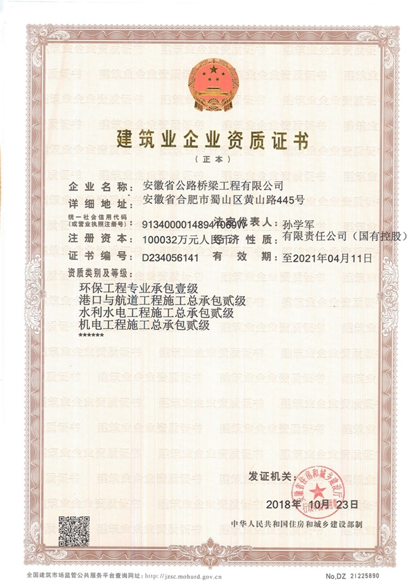 10月23日,公司环保工程专业承包壹级、水利水电工程施工总承包贰级、机电工程施工总承包贰级三项资质顺利通过安徽省住房和城乡建设厅审查核准。三项新资质的取得为公司进一步拓展非公路施工业务,实现经营业务多领域发展打下了基础。