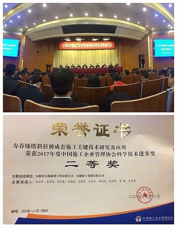 12月26日,“2018年中国施工企业管理协会科学技术奖励大会” 在北京召开,公司主持的课题成果“寿春矮塔斜拉桥成套施工关键技术研究及应用”经过专家评审,被鉴定为国际先进水平,荣获二等奖并接受了表彰。