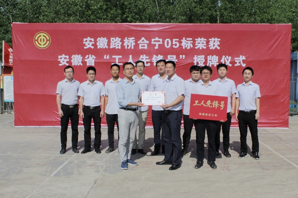 5月22日下午,省建设建材工会副主任叶雪清一行莅临合宁05标项目,代表省总工会正式授予项目安徽省“工人先锋号”奖牌。集团工会主管杨松、公司工会主席杨建强等参加授牌仪式。