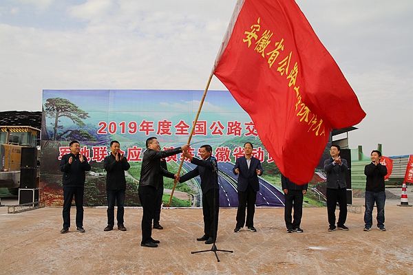 随后举行了授旗仪式,章后忠将一面“安徽省公路工程保障大队”旗帜郑重授予公司总经理钱申春。