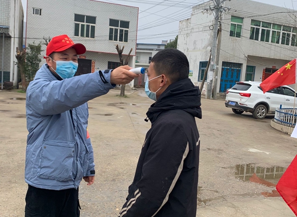 中共党员董峰在为村民测量体温