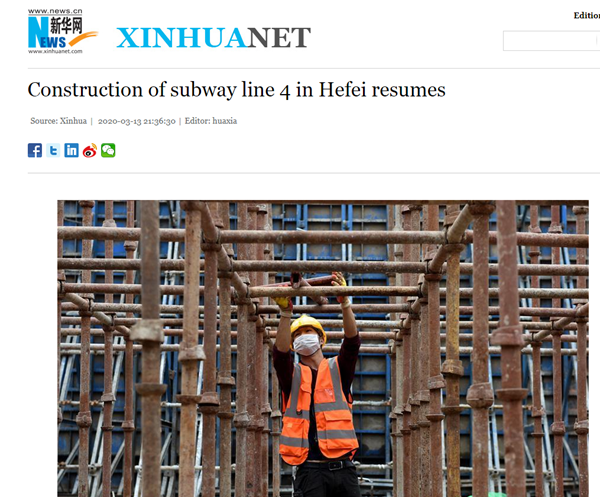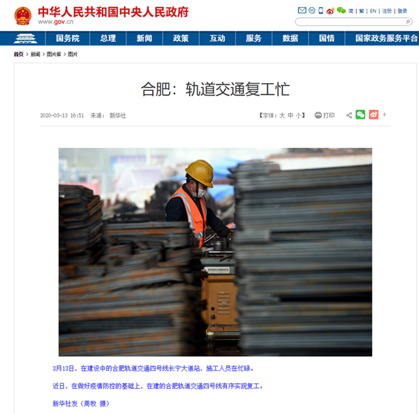 近日,中华人民共和国中央人民政府官方网站、新华社同时以《合肥轨道交通复工忙》为题,报道了公司承建的合肥轨道交通4号线长宁大道站复工复产情况,用8张图片展现了现场全面复工复产后的施工场景。