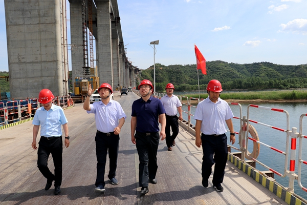 钱总深入施工现场,实地察看了项目工程进展、安全质量管控、现场施工组织等情况,详细询问了主桥合拢段工期节点计划并就进一步加快项目建设进度进行了部署安排。在项目南引桥,钱总询问了安全管控手段、进度安排计划、质量保证措施。他强调,黄河特大桥项目位于小浪底库区内,项目部要提高站位,进一步做好绿色文明施工,把项目建设对黄河生态环境的影响降到最低,彰显国企担当。