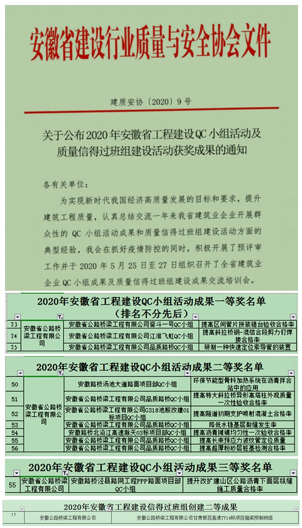 6月4日,安徽省建筑质量与安全协会公布了2020年安徽省工程建设QC小组活动及质量信得过班组建设活动获奖成果名单。公司QC小组申报的《提高区间管片拼装错台验收合格率》等3项成果荣获一等奖,《环保节能型骨料加热系统在沥青拌合站中的应用》等7项成果荣获二等奖,《提升改扩建山区公路沥青下面层纵缝施工质量合格率》荣获三等奖。同时,甘肃银百高速TY14标项目箱梁预制班组荣获安徽省工程建设信得过班组创建二等成果。