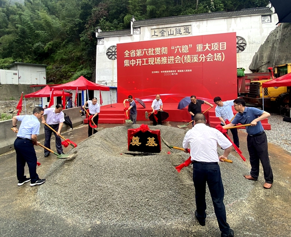 6月19日,安徽省第六批贯彻“六稳”重大项目集中开工现场推进会(绩溪分会场)在公司承建的S456绩溪至谭家桥公路上金山隧道项目举行,该项目开工仪式也同期举办。绩溪县委书记黄德泉现场宣布全县第六批贯彻“六稳”重大项目集中开工。县委常委、常务副县长胡旭华发表讲话,公司党委副书记、总经理钱申春应邀出席并致辞。县政府副县长、县经开区管委会主任刘林发主持仪式。