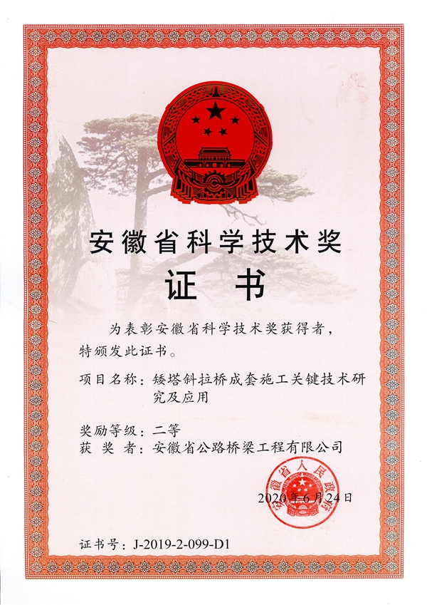 近期,公司主持申报的《矮塔斜拉桥成套施工关键技术研究及应用》课题,通过层层筛选,荣获“2019年度安徽省科学技术奖二等奖”。