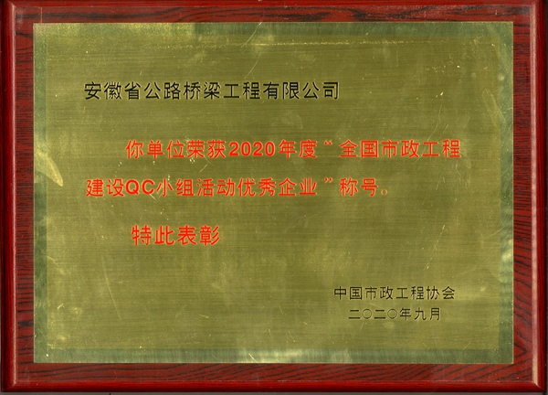 近日,中国市政工程协会组织召开2020年度全国市政工程建设优秀QC小组成果发布会。大会总结交流了2019年市政工程建设QC小组活动经验,评选表彰了QC小组活动优秀企业。公司荣获全国市政工程建设QC小组活动优秀企业。