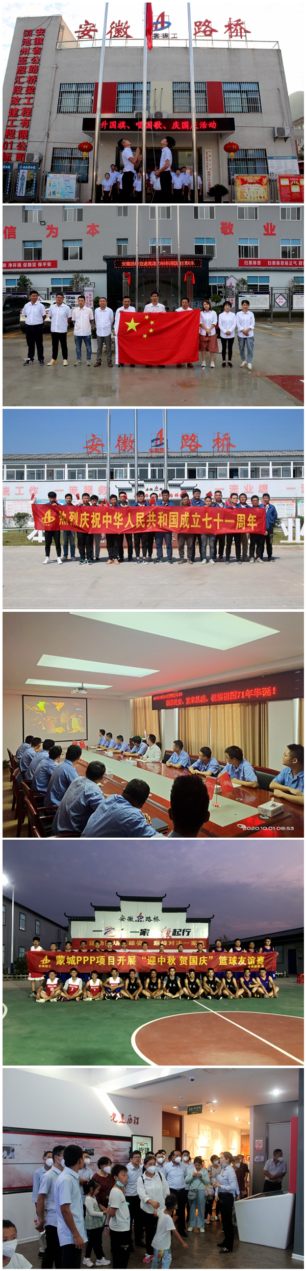 国庆前夕,市政分公司开展“学习强国·一站到底”迎中秋庆国庆知识竞赛,以赛学史,吸引了来自十多个项目青年员工的积极参与。国庆当日,福建漳州项目、陕西合阳项目、江西宜遂高速P3标、河南黄河特大桥项目、固蚌02标、徽州大道等省内外重点项目共同举行“升国旗、唱国歌、庆国庆”主题活动,表达对祖国母亲的祝福之情。明巢高速05标、合肥轨道4号线01标等项目党支部组织全体员工集中观看《我和我的祖国》《建国大业》《八佰》等爱国题材电影。凤阳ppp项目、庐江片区项目组织员工就近参观爱国主题教育基地,接受一次深刻的理想信念和爱国主义教育。此外,池州G318改建工程、蒙城PPP、芜黄高速等项目还结合“家文化”建设,邀请职工家属到项目部共庆佳节。