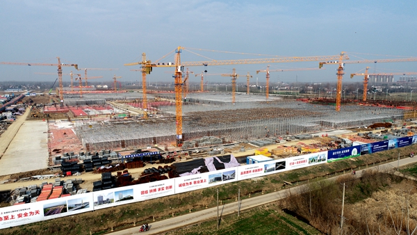 2月12日,农历大年初一,在舒城县智慧电子小镇EPC总承包项目施工现场,数百名工人正在进行厂房钢筋帮扎、支架搭设。