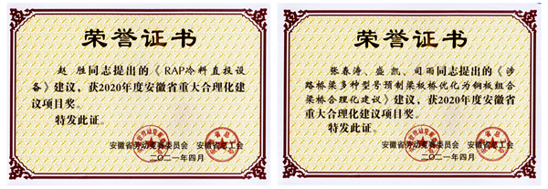 近年来,公司高度重视引导职工积极参与合理化建议,建立并不断完善相应激励措施,2017年以来,公司累计获得47项安徽省重大合理化建议项目奖,在降低生产成本、提高生产效率和推动公司高质量发展方面作出了显著贡献。