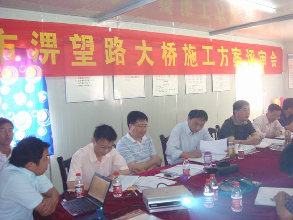 6月1日,六安市淠望路大桥索塔下横梁、索塔、主桥边跨及引桥支架现浇施工方案评审会在项目部会议室召开。会议由公司的总工程师彭申凯主持,特邀了安徽省公路局总工朱新实、安徽省交通规划设计研究院桥梁分院院长王胜斌、副院长席进、合肥工业大学教授方诗圣、安徽省交通职业技术学院土木系主任王丰胜等知名桥梁专家。六安市建委、质监站、安检站、淠望路大桥监理部、监控等单位相关代表也参加了会议。