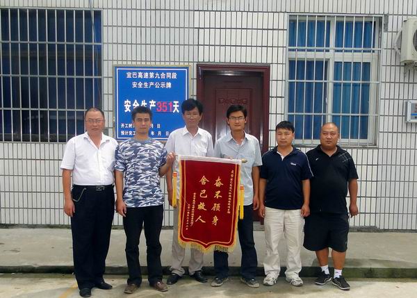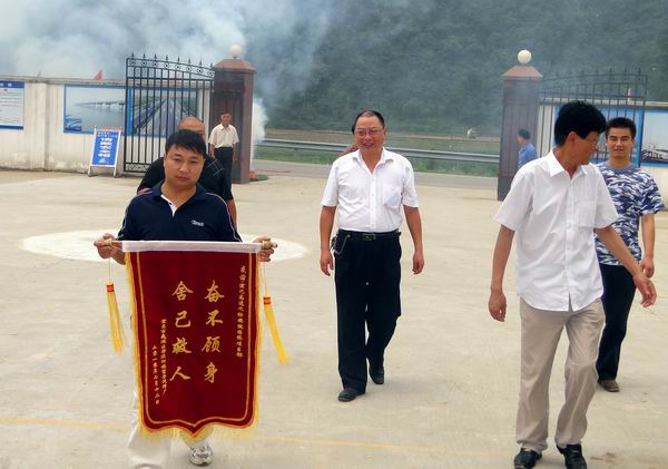 为感谢救人宜昌汽修厂送锦旗到宜巴09标 发布时间:2010年07月20日 来源:宜巴09标 发布人: 作者:晏永超 浏览:4522次 7月15日,公司宜巴09标项目部礼炮声隆隆,喜气洋洋。宜昌市夷陵区雾渡河镇富贵汽修厂为感谢公司员工奋不顾身抢救落水人员特送来锦旗,锦旗上写着“奋不顾身,舍己救人”。 6月26日,福贵汽修厂员工驾车经过我项目二工区马家河二号桥附近时,突然冲入河中,我部员工王雪松、韦祥峰等见此情景,奋不顾身跳河救人,同时项目部积极调配车辆设备,奋力施救,经过一个小时的救援,驾驶员获救。夷陵区电视台对此进行报道,引起了强烈的社会反响。 王雪松、韦祥峰等人在接受夷陵区光电中心记者采访时谦虚的说,面对危险,任何人都会主动施救,我们只是做了安徽路桥人应该做的事情。一个人就是一面旗子,王雪松、韦祥峰等就是安徽路桥的一面旗子,飘扬在宜巴高速路上。