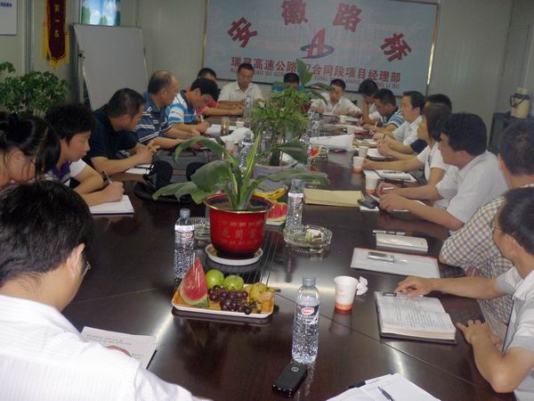 下午,考核组和项目部主要负责人以及项目各部门负责人在项目部会议室召开检查考核反馈会议。会上,刘经理将瑞寻高速A7标的工程量完成情况、进度、安全、质量、计划执行及成本管理等情况向考核组人员作了汇报,同时指出了我项目部存在的一些问题。接着,考核组成员分别将各项检查情况反馈给我项目部,指出了我项目在安全管理、财务、核算审计、企业发展、人力资源、材料管理、机械设备管理、项目管理、项目质量等方面存在的问题以及解决措施。