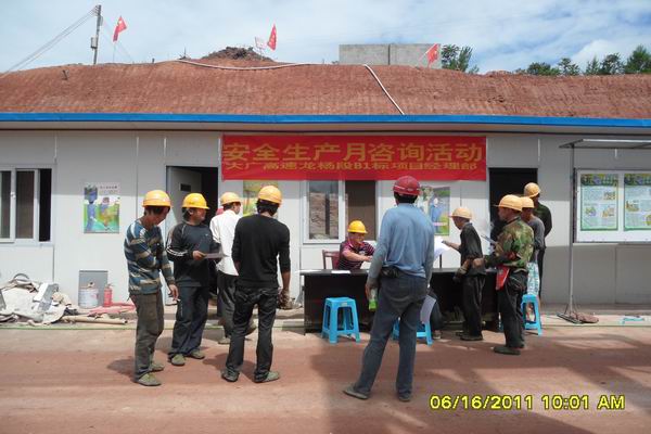 上午10时半左右,赣州高速公司安监办刘主任、项目办综合处李处长等业主单位领导来我标段现场,指导检查安全月咨询活动开展情况,并接受现场工人有关安全生产知识的咨询。在对我标段安全生产月咨询活动开展情况表示赞许的同时,刘主任一行也提出了要求,希望我部采取多种形式开展安全生产宣传教育工作,使一线工人明确自己的权利、义务,掌握施工安全知识和技能。