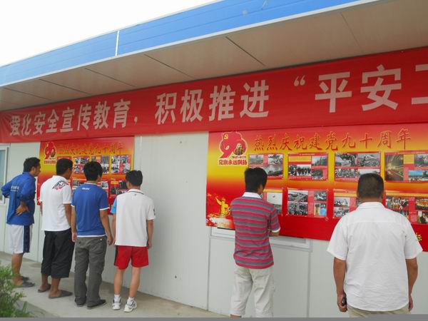 《党旗永远飘扬》系列图片展用大量翔实的资料照片生动地展现了中国共产党90年来的辉煌成就。大家一边观看一边激动地议论和感慨:“有了共产党,才有了中国翻天覆地的变化,才有了中国繁荣富强的今天”。通过参观,更加激发了员工们对中国共产党的热爱之情,坚定了大家的理想信念;激励了项目一线员工更加积极的投入到蚌淮高速的施工建设,为实现公司的“十二五”战略规划做出自己应有的贡献。晚上7点,在项目操场上,露天展映的抗日战争影片有红色经典影片《七七事变》、《狼牙山五壮士》、《地道战》,让大家又受了一次红色精神的洗礼。